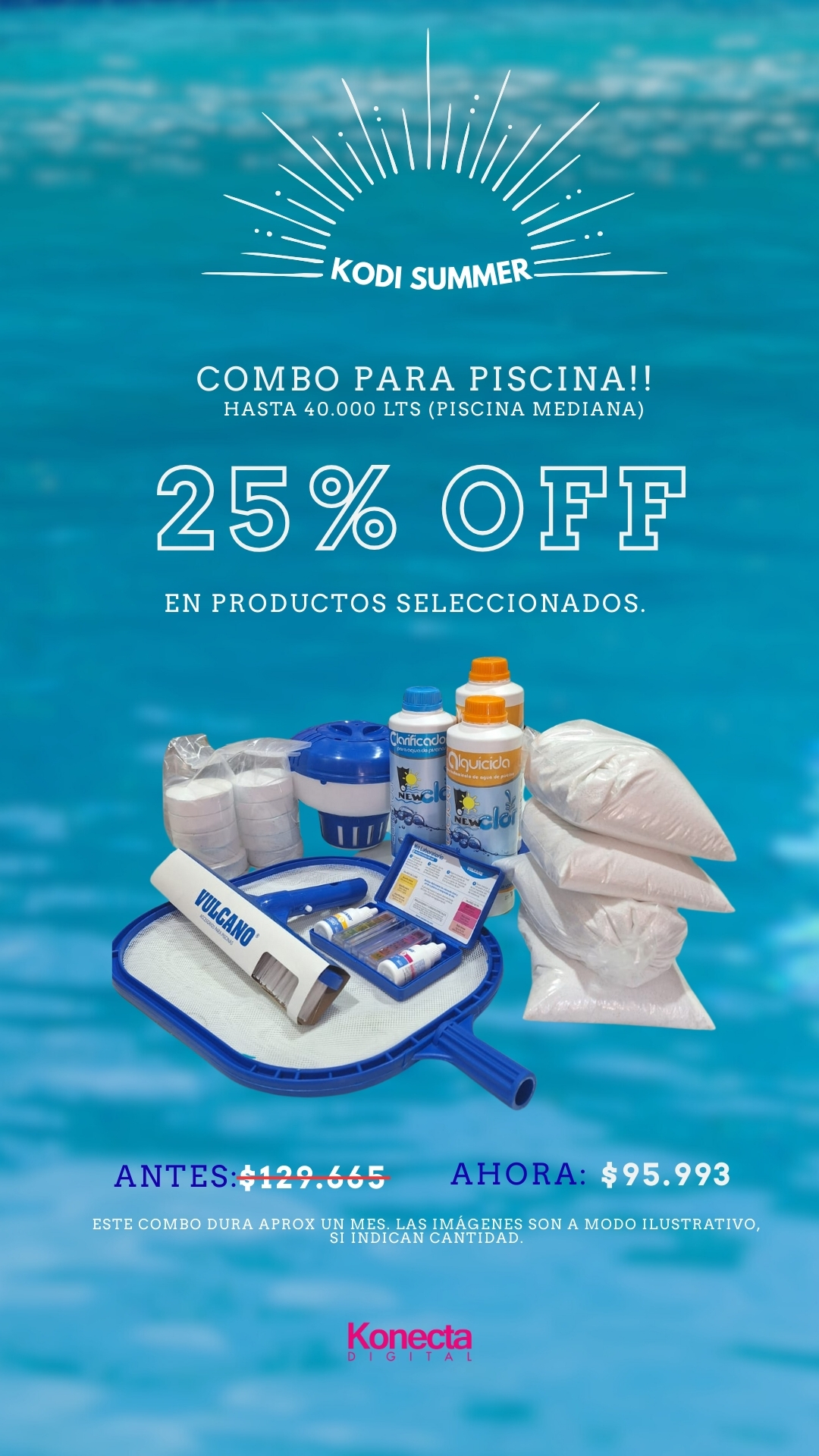 Solución integral para mantener tu piscina MEDIANA impecable por aproximadamente un mes. Todo lo que necesitás en un solo kit para dejar de adivinar y empezar a ahorrar.