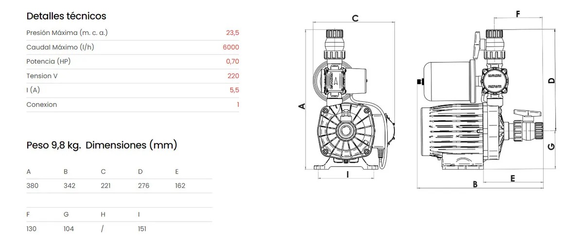 - Seguridad: Incluye protección contra marcha en seco para evitar daños por falta de agua.