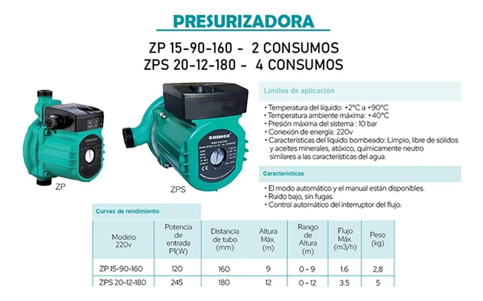 La Bomba Presurizadora SHIMGE ZPS 20-12-180 es una circuladora/presurizadora diseñada para solucionar problemas de baja presión en viviendas, brindando un aumento constante y fiable para hasta 3 o 4 consumos simultáneos (duchas, grifos). Este modelo destaca por su funcionamiento extremadamente silencioso y su diseño versátil para la instalación.